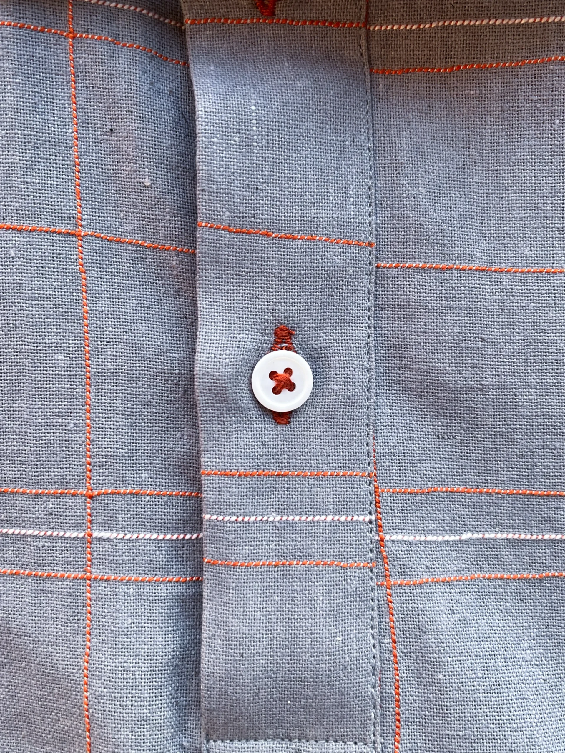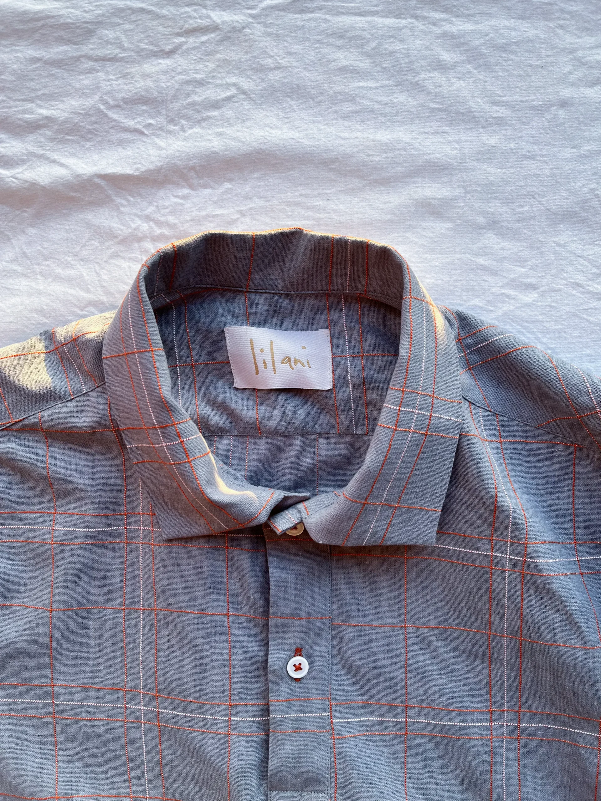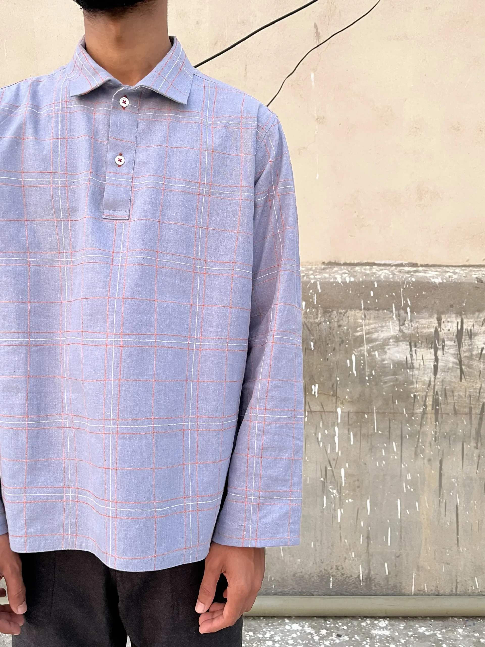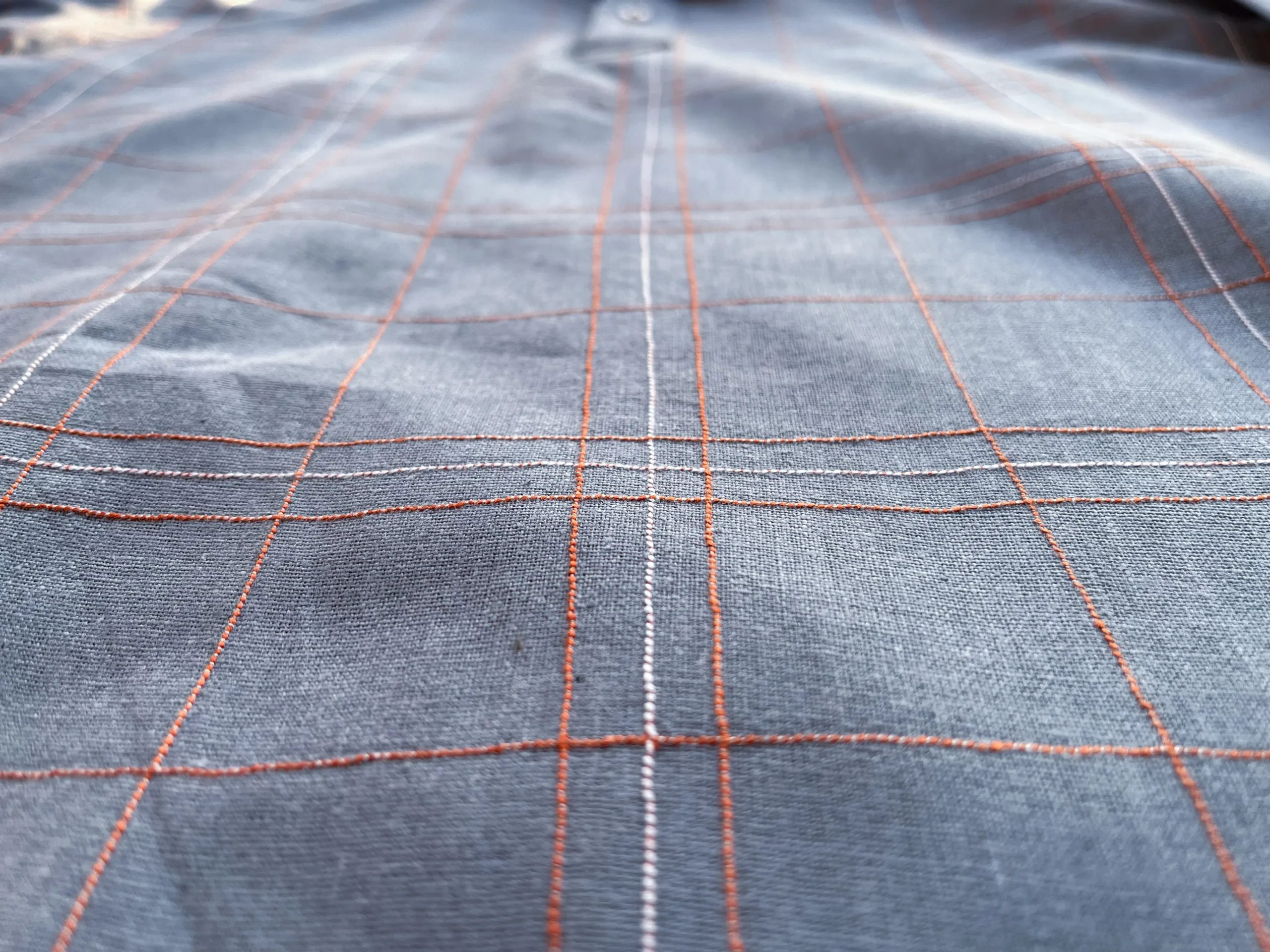 - Manually embroidered strings through a sewing machine; fabric is guided by hands giving it an asymmetry that is unique to each shirt
