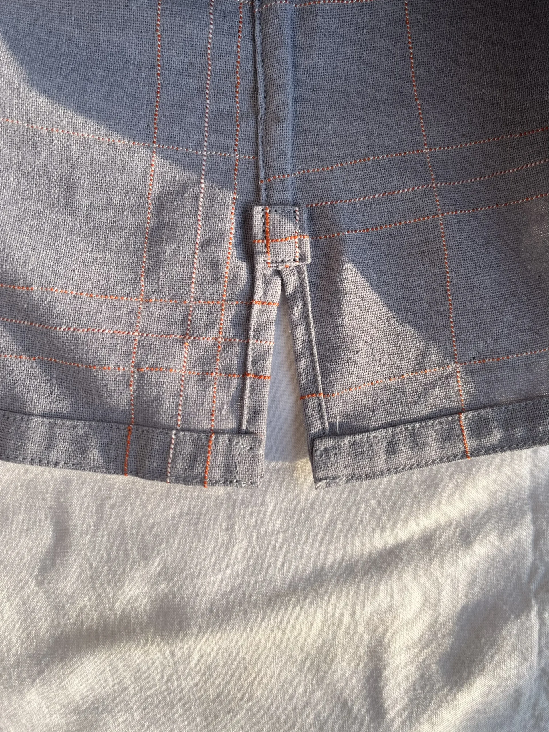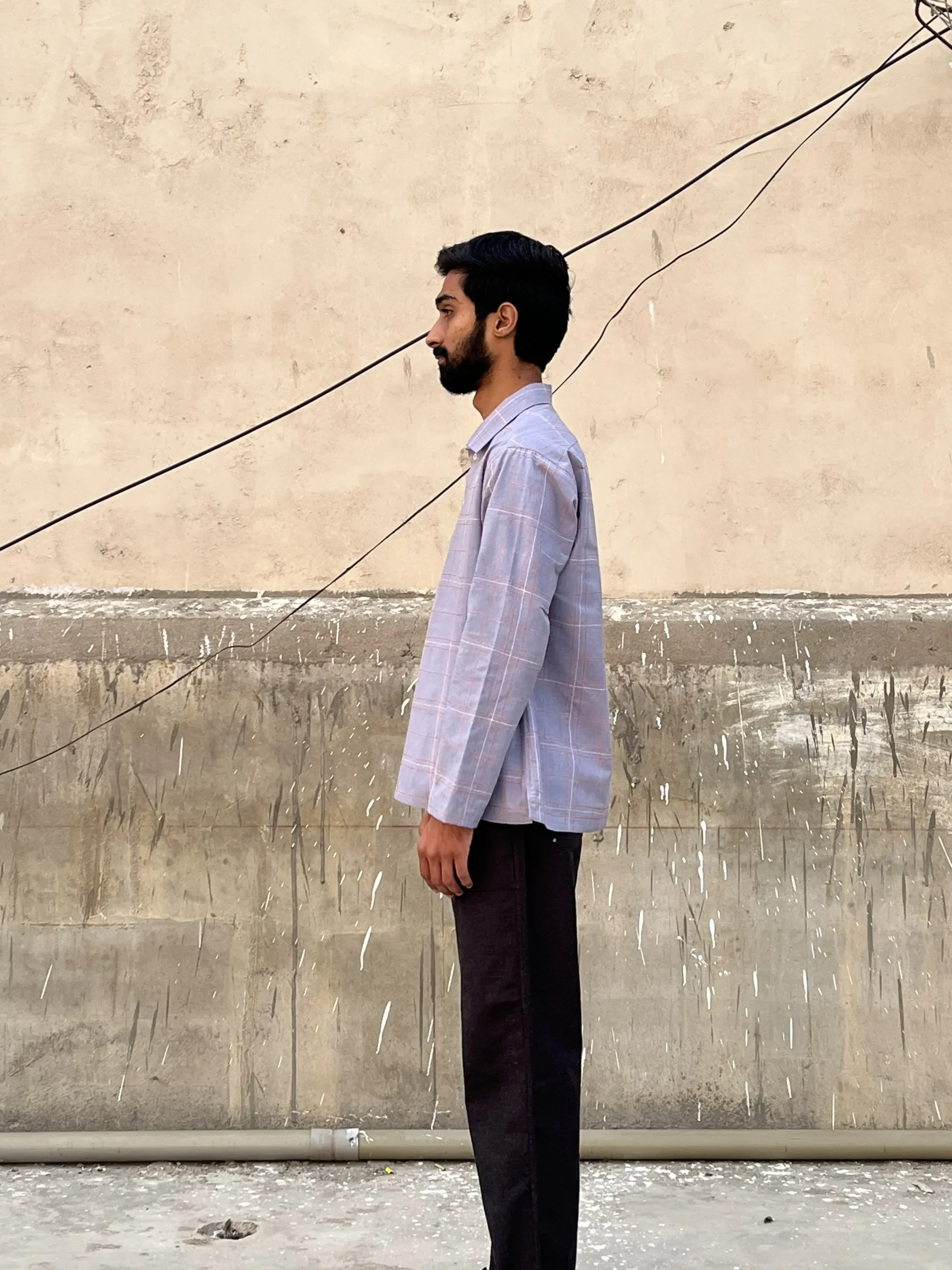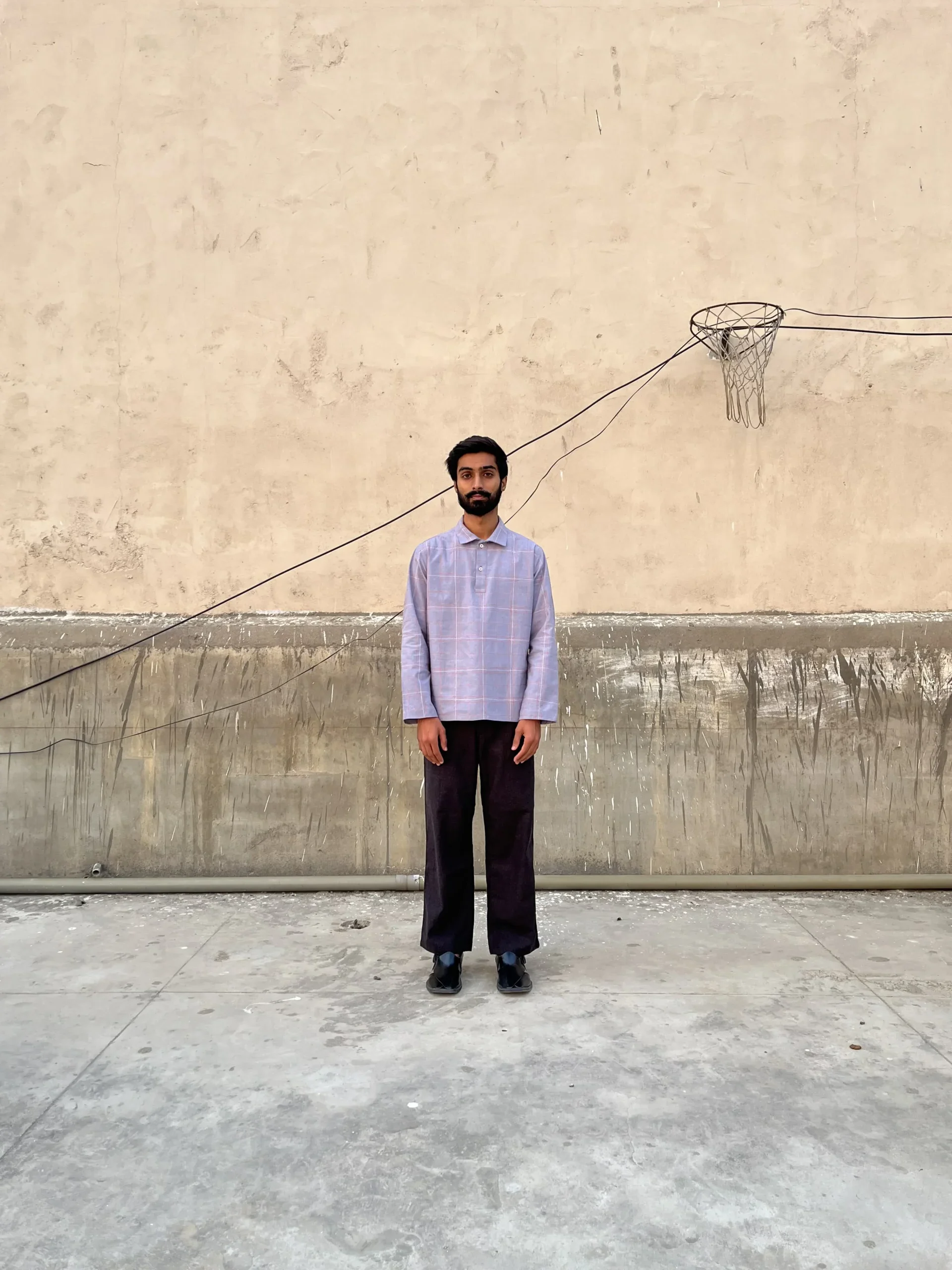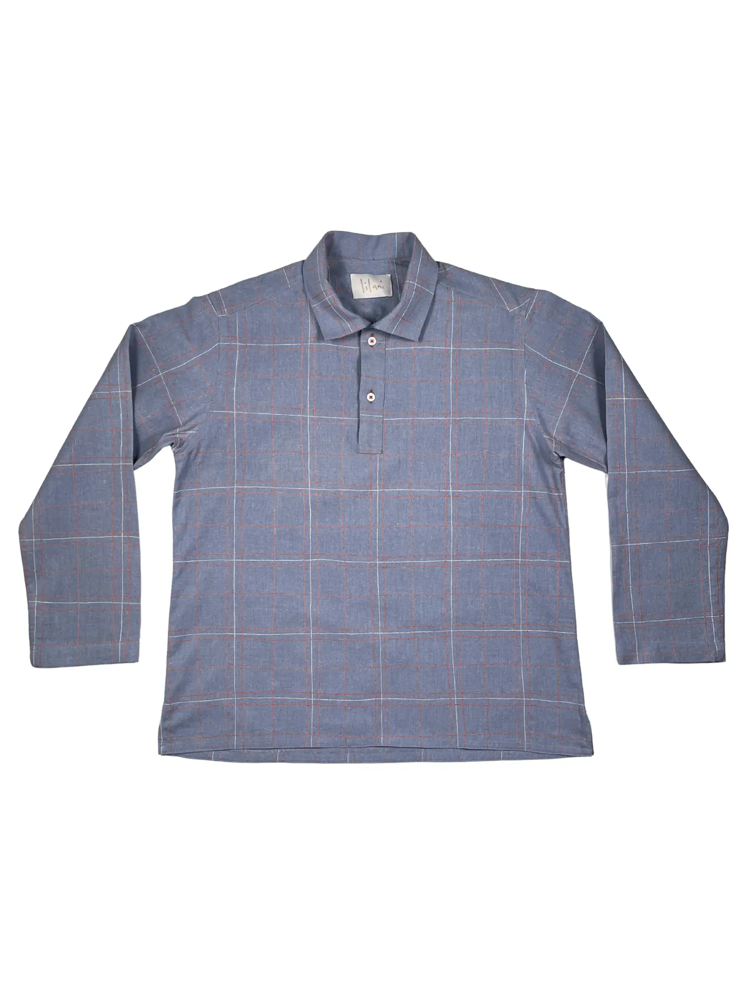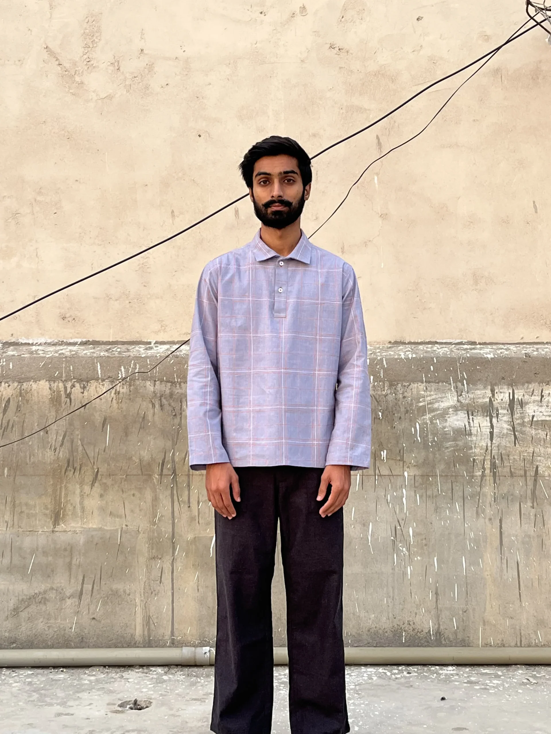 - Manually embroidered strings through a sewing machine; fabric is guided by hands giving it an asymmetry that is unique to each shirt